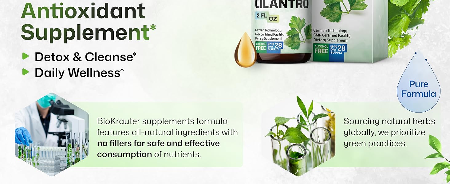 BIO KRAUTER Cilantro Supplement is a vegan, alcohol-free tincture made from high-quality cilantro, designed to provide a rich source of antioxidants. Utilizing advanced German technology, this supplement ensures up to 98% absorption, making it an effective choice for detox and immune support. With a pleasant flavor profile and simple ingredient list, it's perfect for health-conscious individuals looking to enhance their wellness routine.