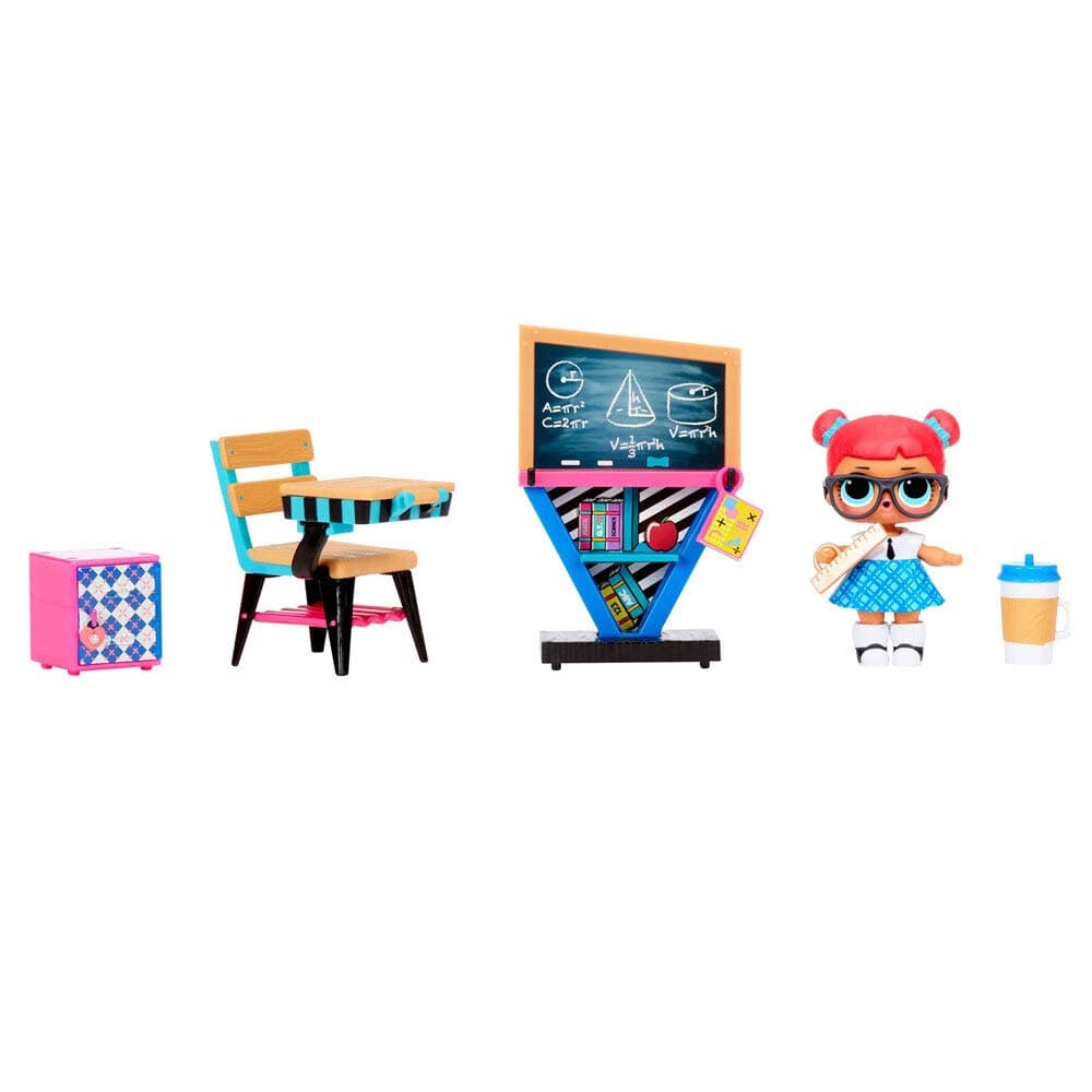 The L.O.L. Surprise! Furniture Classroom set features a fold-out playset with over 10 surprises, including the rare re-released Teacher's Pet doll. Designed for ages 4-15, this compact and collectible classroom includes a blackboard, desk, locker, and school accessories, all compatible with other L.O.L. Surprise! furniture and dollhouses. Perfect for fans and collectors looking to expand their L.O.L. universe with exclusive characters and interactive play.