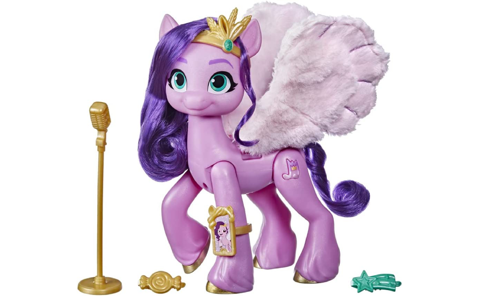 Meet Princess Petals, a vibrant 6-inch pink Pegasus from 'My Little Pony: A New Generation'. This interactive toy sings a catchy tune, features flapping wings, and comes with 5 fun accessories, making it the perfect gift for kids aged 5 and up.