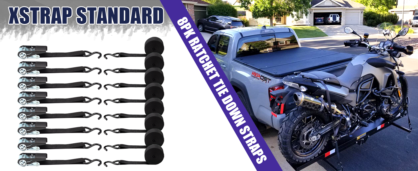 The XSTRAP STANDARD Ratchet Tie Down Straps come in an 8-pack, featuring 1'' x 10 ft straps with a remarkable 900 LB break strength and a 300 LB working load limit. Designed for versatility, these straps are perfect for securing a variety of loads, from appliances to motorcycles, while the coated 'S' hooks prevent scratches. Each set includes a convenient drawstring bag for easy storage and transport.