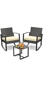 I have been looking to “upgrade” our old, dirty patio table and chairs—this set did it! The color matches our aesthetic. The rocking chairs are perfect for morning coffee or evening drinks while watching the bird feeder. My only complaint is the table. The size of the table is right, but I’m not a fan of the glass top. It is held in place by a couple of suction cups. We had a problem with it sliding forward off the suction cups when we put our drinks on the table. It’s just time before it breaks. Even with that, this set is totally worth the cost. Assembly was relatively easy. It took me 30 minutes to assemble with only one mistake on my part (I put one screw in backwards). I plan to buy a second set so we have chairs for guests to enjoy!