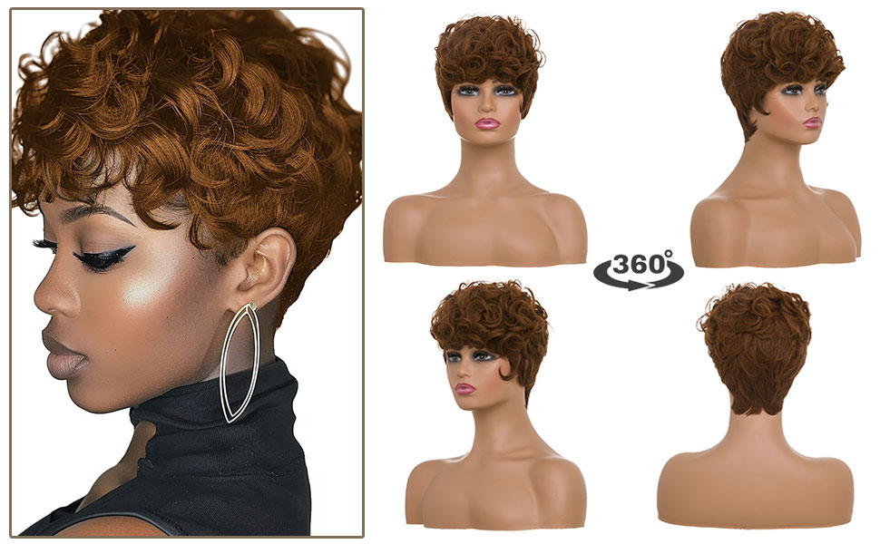 The MOONSHOW Short Pixie Wig offers a natural-looking, curly auburn brown style designed specifically for Black women. Featuring a tapered back, adjustable straps, and dual combs, it guarantees a secure and comfortable fit. This synthetic wig comes with a free wig cap and razor comb, empowering you to customize your look effortlessly for both everyday wear and special occasions.
