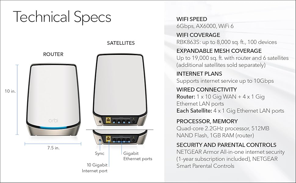 The Netgear Orbi RBK863SB is a premium tri-band WiFi 6 mesh system delivering up to 6Gbps speeds and coverage across 8,000 sq.ft., including outdoor areas. Featuring a cutting-edge 10 Gigabit port, patented antenna design boosting coverage by 20%, and dedicated backhaul for up to 100 devices, it ensures ultra-fast, reliable connectivity. Comes with 1-year NETGEAR Armor cybersecurity for real-time protection and privacy.