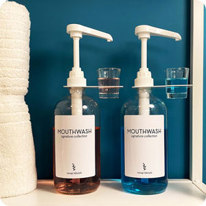 - SMART DISPENSING - Innovative cup holder with pump delivers perfect mouthwash dose without spills