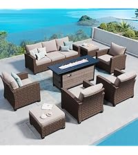 I spent a long time researching patio sets before finally deciding on this one—and I’m so glad I did. It checked all the boxes for style, function, and comfort. We bought it for our newly expanded deck, and it arrived ahead of schedule, just in time for our big family Easter gathering. The set came in about 6 or 7 boxes (I didn’t move them myself, so not sure on the exact count), and everything was well-packaged and intact. To avoid any stress and make sure it was ready in time, we hired a local handyman and his helper for assembly. It took them about 5 hours to put the whole set together, and they did a great job. The set includes a three-person couch, 2 regular chairs, 2 swivel chairs, 2 ottomans, and a fire pit. The blue fire glass in the fire pit is a beautiful touch that really adds something special. All the seats come with both bottom and back cushions. They're very comfortable—though the back support could be a little stronger for my taste. That said, the swivel chairs were a smart choice so we can easily turn and view a TV if we decide to add one later. The cushion color is lovely and modern. I’m a bit concerned about potential snags over time, but so far, so good. I plan to order a storage box to keep them protected from the weather and our cats, who love lounging on our outdoor furniture. Overall, the quality feels sturdy and well made, and the whole setup has already become a favorite gathering spot. Would definitely recommend!