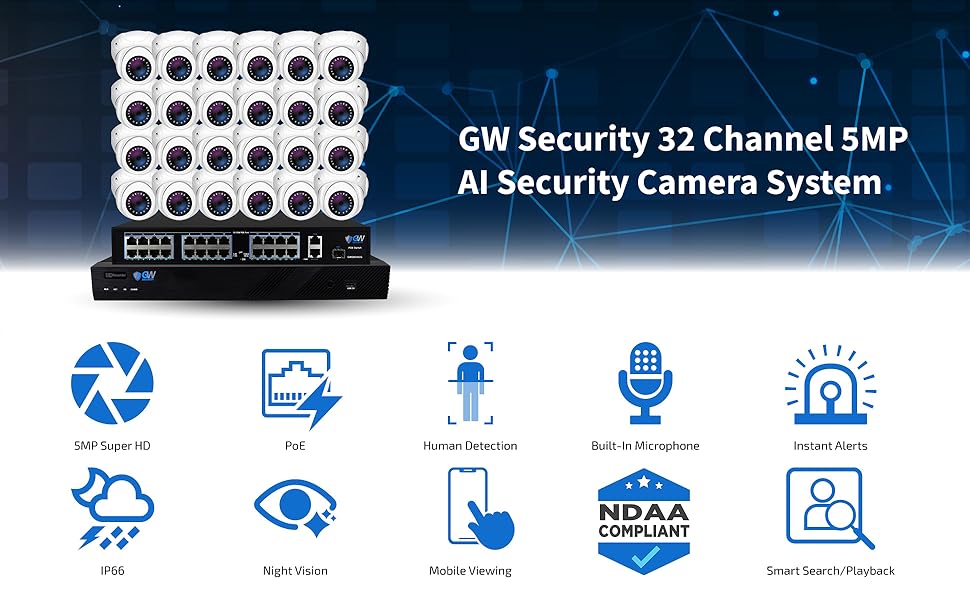 GW Security24 Channel 5MP NVR 1920P IP Camera Network POE Video Security System - 24 x 5.0 Megapixel (2592 x 1920) Weatherproof Dome Cameras, Quick QR Code Easy Setup, Pre-Installed 8TB Hard